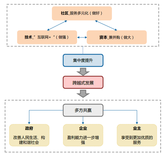 從社區物業行業現有的主體關系來分析,在物業管理市場中,基本矛盾有兩個:一個是服務主體的專業性較差,和被服務主體的體驗意識覺醒之間的矛盾,二是業務、開發商、物業服務企業和政府的信息不對稱的矛盾。這兩個矛盾是物業管理行業變革的內在動力。隨著行業標準化集約度的提升,物業管理規范以及服務價格標準的共識將會逐步達成。而社區物業逐步完善的外部驅動因素兩個,一是“互聯網+”的宏觀大勢,互聯網勢力加速向社區物業領域滲透;二是當房地產由增量市場轉變為存量市場,社區物業服務是盤活存量、增加客戶粘性、實現企業及品牌增值的關鍵。