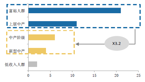 盡管中國GDP增速有所放緩,但未來消費市場仍有驚人的增長空間,即使中國的實際GDP增速進一步放緩至5.5%,到2020年消費市場規模仍將擴大50%,約2.3萬億美元,總市場規模將會達到6.5萬億。由于經濟增長的放緩,主要推動消費市場規模增加的原因將有所變化,消費結構的調整以及消費觀念的變化將成為構筑市場增量的主導。上層中產及富裕階層消費者、新世代消費者及網絡消費是在整體市場格局結構里面增長幅度較快的部分。