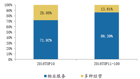對比來看,多種經營在為百強企業創造利潤方面發揮了關鍵作用。在這種業務特征街結構下,龍頭物業管理企業在業務拓展的策略上一方面堅持擴大管理規模,通過提升服務水平和管控制量提升基礎業務的業績貢獻能力;另一方面,在多種經營服務領域,積極融合滲透新技術,開展附加值高的多元業務,培育新的業績增長點。