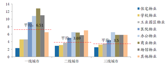 2015年百強企業的管理項目平均物業費為4.23元/平米,與2014年基本持平,各業態除商業物業之外,與14年相比均有不同水平的提升(見圖5)。從城市分布情況來看,一線城市平均物業費為6.51元/平米,二線和三線城市分別為3.89元/平米和3.5元/平米。