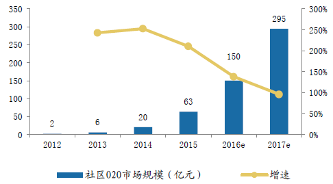 2012-2017年狹義社區O2O市場規模(億元)及增速