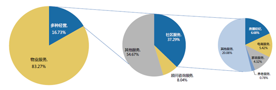 2015年物業管理行業在并購擴張和業務拓展的大背景下,百強物業管理企業全年實現營業收入總額1135.6億元,同比增幅達到27.24%,收入增速進一步提升。從收入結構來看,物業管理服務占比達到83.27%,百強企業物業服務總收入945.67億元,同比增長33.23%,在企業大舉兼并收購和積極外拓項目的驅動下,物業服務收入增長明顯。在做好“守正”經營的同時,百強企業大力創新、拓展多種經營服務,多種經營收入總額為189.9億元,增速為3.94%,占營業收入比例為16.73%。百強企業開展的多種經營業務主要包括社區服務、顧問咨詢以及根據自身特色開發的其他業務。其中社區服務收入總值為70.83億元,占多種經營比重37.29%。;其中,房屋經紀服務和社區電商服務是大部分百強企業開展多元業務的重要方向,兩者在多種經營收入中占比分別為6.68%和5.42%。同時,基于自身技術優勢和豐富的管理、運營經驗,百強企業開展的顧問咨詢業務全年收入727.10萬元,占為8.04%。