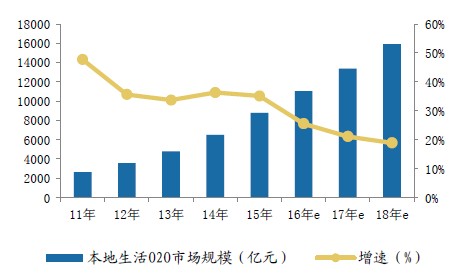 2011-2018年本地生活O2O市場規模(億元)及增速