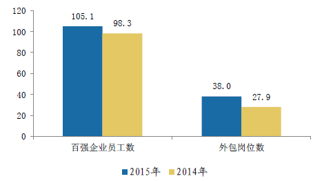 物業管理企業可以通過將基礎物業外包來降低業務運營成本,同時提升專業服務水平。15年有169家百強企業將部分基礎業務外包由專業企業來進管理,與14年相比上升6.29%。百強企業15年外包員工人數為38萬,比14年增長10萬人,增長幅度達到36%。