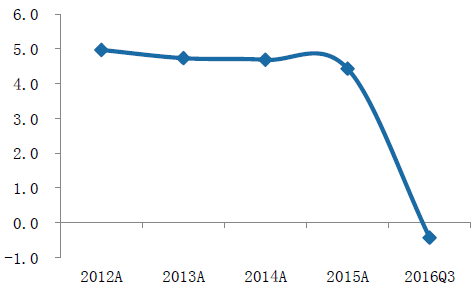 2012-2016年品牌服飾業(yè)平均經(jīng)營凈現(xiàn)金流(億元)
