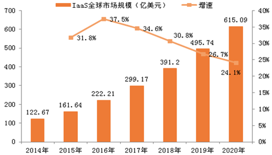 當前,全球云計算市場增速有所放緩,但仍處于較高水平。2015 年,全球云計算市場總體規模為 522.38 億美元,至 2020 年將有望達到 1435.28 億美元,2014 年到 2020 年間 CAGR 為 22%。其中 2015 年全球 IaaS 市場規模為 161.64 億美元,到 2020 年將達到 615.09 億美 元,2014-2020 年間 CAGR 為 30%。