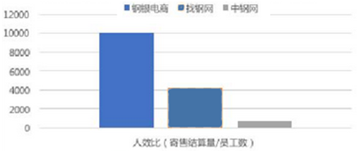 根據(jù)各企業(yè)半年報(bào)和公開(kāi)數(shù)據(jù),鋼銀電商在人效比方面同樣領(lǐng)先。以找鋼網(wǎng)為例,鋼銀電商人效比是找鋼網(wǎng)的2倍有余。