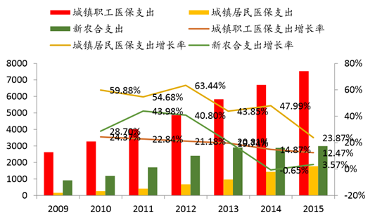 三保支出貢獻存在很大差異,2015 年城鎮職工醫保、城鎮居民醫保和新農合支出 分別為 7532 億、1780 億、2994 億,同比增長 12.47%、23.87%、3.57%。城鎮職 工醫保由于基數的增大,增長趨勢呈下降態勢;雖然我國 2015 年新農合實現了農村人 口基本全覆蓋,但是近幾年城鎮化進程的加快,新農合參與人數呈現下降趨勢,導致 新農合的支出增速呈現下降趨勢。