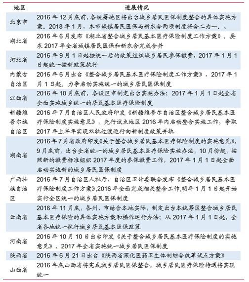 截至 2016 年 9 月,國內已經有包括上海市、天津市、浙江省、山東省等 8 個省、 自治區和直轄市已經完成了醫保合并,包括河北、湖北、內蒙古、江西、新疆、北京 等 12 個省份明確制定了醫保合并的時間進度,剩余 11 個省份的政策還在醞釀中。 從執行上看,在實現城鄉居民醫保并軌的地區,絕大部分是由人力資源和社會保障部 門管理和經辦,但也有并軌到新農合系統的地區,如安徽省界首市、寧國市。