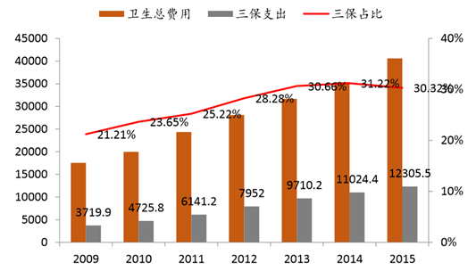 衛生總費用作為全社會醫療衛生系統的支付端,是由政府衛生支出、社會衛生支 出和個人衛生支出三部分構成,其中醫保支出作為其中重要的組成部分。歷年三保支 出占衛生費用的支出比例呈上升趨勢,2015 年衛生總費用和三保支出分別為 40588 億、 12306 億,三保占比 30.32%,預計我國十三五期間的醫保合并及醫保籌資水平的統 一和提高將會繼續提高三保支出占衛生費用的比例。