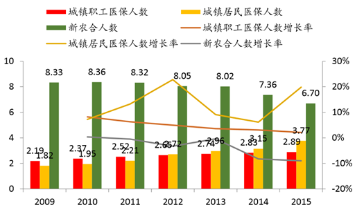 城鎮化進程的加快直接導致新農合的參保人數從 2011 年開始下降,2015 年相比 2010 年降低 1.66 億人,同比下降 120%,而城鎮居民醫保參保人數 2015 年相比 2011 年增加1.82 億,同比增加 93%。城鎮化進程的加快為城鎮居民醫保和新農合的合并提供了 契機。