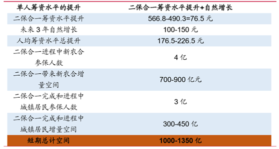 而籌資水平的提高,也會帶來二保合一完成和進程中省份的城鎮居民保險的增量空 間 300-450 億。故而短期二保合一的短期空間增量為 1000-1350 億。