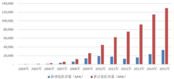 2004 年-2015 年我國(guó)新增和累計(jì)風(fēng)電裝機(jī)容量