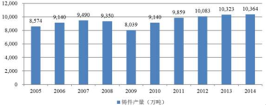 根據(jù)《Modern Casting》雜志公布的世界鑄件產(chǎn)量普查結(jié)果,2012年世界鑄件總產(chǎn)量達(dá)到10,083萬(wàn)噸,超過歷史水平,比2011年增加2.27%,表明世界鑄造業(yè)在經(jīng)歷了2009年的急速下滑后,已基本恢復(fù)到金融危機(jī)發(fā)生前的水平;2013年,世界鑄件總產(chǎn)量在2012年的基礎(chǔ)上增長(zhǎng)約2.38%,總計(jì)達(dá)到10,323萬(wàn)噸,創(chuàng)下歷史新高;2014年,世界鑄件總產(chǎn)量達(dá)到10,364萬(wàn)噸,保持持續(xù)增長(zhǎng)。2005年-2014年世界鑄件產(chǎn)量情況如下圖所示: