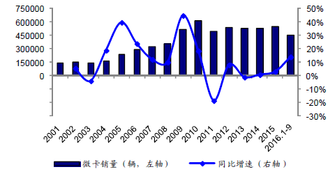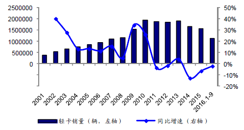 2001-2016年國內(nèi)輕卡銷量及同比增速