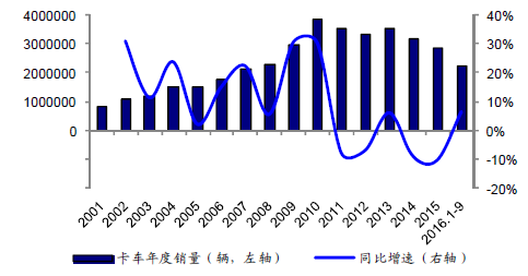 2001-2016年國內(nèi)卡車銷量及同比增速
