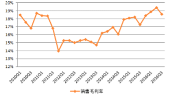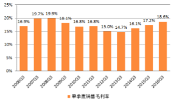 (一)毛利率:整體高點回落,過半數子行業環比下降行業毛利率高點回落。2016年3季度基礎化工行業毛利率為18.6%,較2016年2季度高點回落,仍處于近年來的較高水平;觀察過去十年基礎化工行業3季度銷售毛利率可以看出,當前的行業毛利率處于歷史同期中的較高水平。