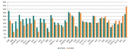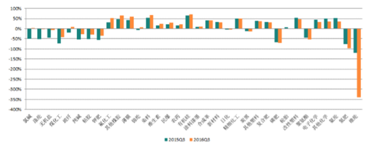多數子行業收入增速較2016年2季度有所上升。2016年3季度,多數子行業營業收入同比增速較2016年2季度有所上升。其中,錦綸、煤化工、涂料漆墨、電子化學、聚氨酯、其他橡膠、滌綸、維生素等行業3季度收入增速提升較大,煤化工、炭黑、民爆、其他塑料、氨綸行業由負增長轉為正增長,磷肥、氮肥、維綸行業盡管營業收入增速提升但仍為負增長;鉀肥、復合肥、新材料等行業收入同比增速3季度比2016年2季度下降較多。