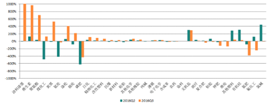三季度利潤同比增速上行,主要因素是:行業整體的產能投放高點已過,各子行業供求逐步改善,三季度化工品價格整體上行,部分子行業如鈦白粉、維生素、聚氨酯等子行業利潤同比增速上升幅度較大。