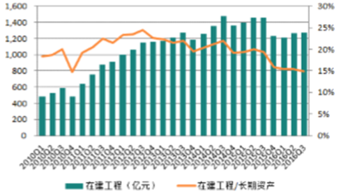 (二)在建工程/長期資產:行業整體環比微降,子行業下降為主在建工程占比微降。3季度末,行業整體在建工程占長期資產的比重為14.9%,環比2016年二季度微降,位于2010年以來次低水平。