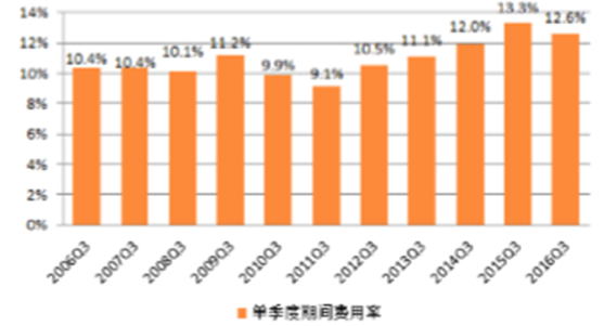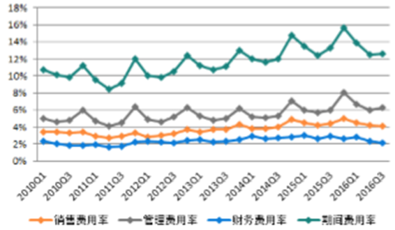 3季度基礎化工行業期間費用率為12.56%,環比2016年2季度微升0.05個百分點。與歷史同期相比,處于近十年來的較高位置,僅次于2015年同期水平。分項來看,期間費用率環比微升,主要是由于管理費用有所下降所致,銷售費用與財務費用均有所下降。