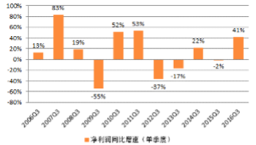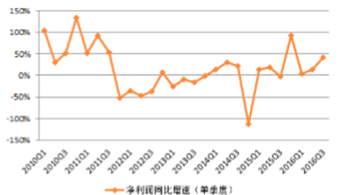 利潤同比增速上升,環比增速下降。3季度基礎化工行業凈利潤同比上升41.3%,增速較2016年2季度有所上升;從歷史同期凈利潤增速看,3季度行業凈利潤增速位于中等偏上水平。環比方面,3季度行業凈利潤環比下降16.8%,主要是毛利率環比回落、期間費用率環比微升所致。