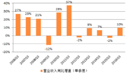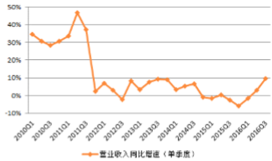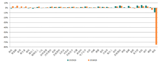 2016年3季度基礎化工行業營業收入同比上升9.62%,延續了去年四季度以來的上升勢頭;剔除季節性因素后,與過去十年中的3季度收入增速相比,行業3季度收入增速處于2012年以來的最高點。