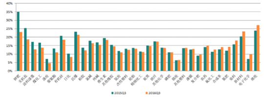 子行業單季度ROE同比升降各半。2016年3季度,子行業單季度ROE較2015年同期升降各半。上升幅度較大的子行業有滌綸、聚氨酯、炭黑、維生素。下降幅度較大的子行業有維綸、磷肥、玻纖。