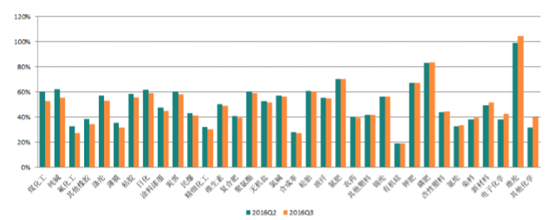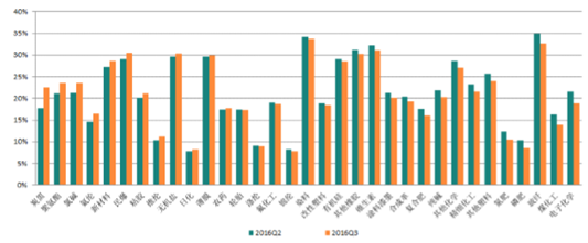 子行業毛利率過半數有所下降。2016年3季度,過半數基礎化工子行業毛利率水平較2016年2季度有所下降。炭黑、聚氨酯、氯堿、氨綸、新材料行業毛利率環比上升明顯,鉀肥、電子化學、煤化工、玻纖、磷肥、氮肥等行業毛利率水平下降較多。
