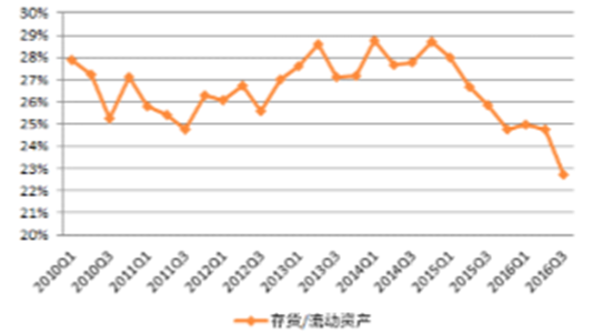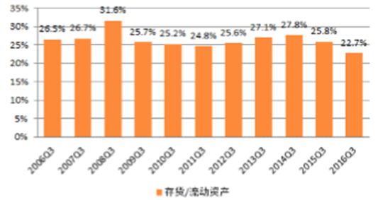 (五)存貨/流動資產:環比與同比均明顯下降,多數子行業下降存貨占比環比與同比均明顯下降。3季度末,行業存貨占流動資產比為22.7%,延續了2015年1季度以來的下降趨勢;與歷史同期比,目前行業存貨水平處于近年來最低位置,較去年三季度下降了3個百分點。