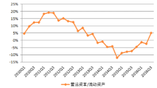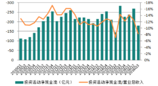 (一)投資活動現金流/營業收入:行業整體驟降,多數子行業下降投資現金流占比驟降。2016年3季度,基礎化工行業投資活動占收入比驟降,絕對值由二季度的12.5%降至8.3%。