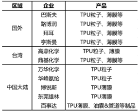 熱塑性彈性體材料產業在全球范圍內發展相對不平衡,從區域上可分為三部分:國外、中國臺灣地區及中國大陸地區。歐美發達國家和中國臺灣地區的熱塑性彈性體材料產業相對成熟,占據著行業中高端市場,如巴斯夫、拜耳、路博潤等是全球主要的 TPU 產品供應商,其產品結構除包括大宗的 TPU 粒子外,還涉及到聚氨酯產業鏈的多個環節,如 TPU上游原材料 MDI 等基礎化工材料、TPU 薄膜等制品;中國的 TPU 企業起步較晚,主要集中在低端的 TPU 薄膜市場, 企業產品結構單一, 萬華化學、華峰氨綸主要生產大宗的 TPU 粒子,博銳斯、東莞雄林等集中生產 TPU 薄膜,專業化的制品生產企業較少。目前,百事達公司已經率先完成了“TPU 彈性體材料及改性材料—TPU 薄膜—軟體油囊油罐—輸油輸水管道—非開挖油罐修復改造”的完整產業鏈布局。