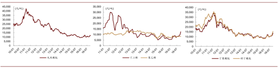 合成橡膠:順丁橡膠跌 7.01%至 14,485 元/噸,丁苯橡膠跌 7.30%至 12,700 元/噸。原料丁二烯成本面支撐走弱,中石油和中石化各銷售公司下調(diào)出廠供價(jià)。