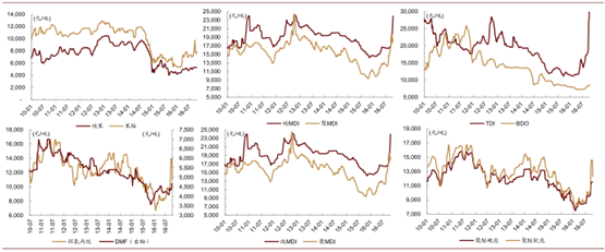 MDI :純 MDI 跌 7.41%至 25,000 元/噸,聚 MDI 跌 1.08%至 18,300 元/噸;原料純苯價(jià)格維持在 5,400 元/噸,苯胺漲 3.75%至 8,300 元/噸。純 MDI:前期價(jià)格大幅上漲,下游對(duì)高價(jià)原料需求有限,市場(chǎng)逐漸回歸理性;聚 MDI:下游需求進(jìn)入淡季。