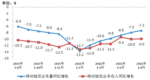 2015-2016年8月移動短信業務量和收入同比增長情況