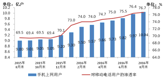 2015-2016年8月手機上網用戶和對移動電話用戶滲透率情況