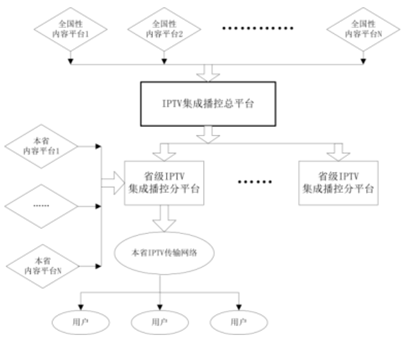 按照廣電總局政策要求,IPTV 業(yè)務在開展過程中,采用中央和省兩級 IPTV集成播控平臺的架構,省級分平臺負責將總平臺傳來的節(jié)目信號與本省內容服務平臺的信號集成在一起,經統(tǒng)一接口接入到本省 IPTV 傳輸系統(tǒng)。省級集成播控分平臺負責節(jié)目的統(tǒng)一集成和播出監(jiān)控、EPG、版權管理,用戶端和計費管理可采取與合作方雙計費、雙認證的管理模式。IPTV 行業(yè)運營模式如下圖所示: