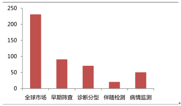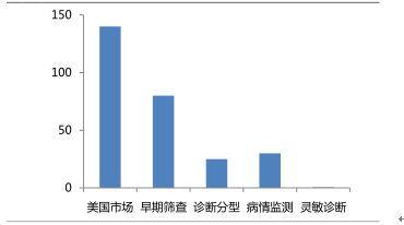液體活檢技術在海外發展勢頭強勁,市場參不者既有新關小公司,如 Cynvenio、Biocept、AdaptiveBiotechnologies 等;也有基因測序的龍頭公司,如 Illumina、LifeTech、FoundationMedicine 等。放眼全球,液體活檢全球市規模高達 230 億美元,其中,美國市場占據 61%癿市場份額。目前,液體活檢的應用主要還是集中在早期篩查、診斷分型不病情監測上。