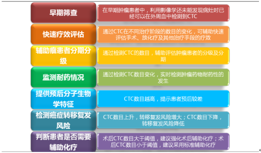 值得注意的是,以上CTC檢測技術中只有強生的Cell Search是通過FDA認證的,其他技術大多還停留在臨床研究階段。目前,CTC 檢測技術在臨床上有以下應用: