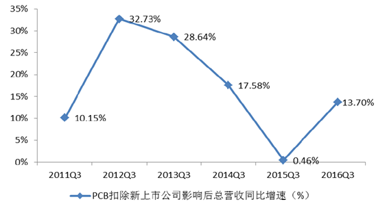 PCB 子類整體營收平穩增長,凈利潤增速反轉。2016 年三季度PCB 子類整體營收增速為13.70%,2015 年同期增速為0.46%,增長超過13 個百分點。凈利潤方面,2016 年三季度增速為46.19%,2015 年同期為增長0.46%。