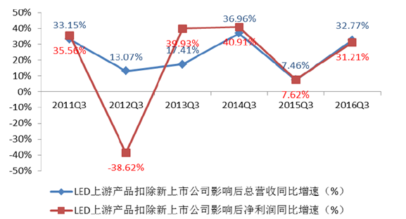 LED上游材料整體扣除新上市公司影響后行業整體營收及凈利潤增速