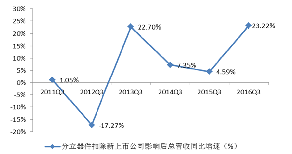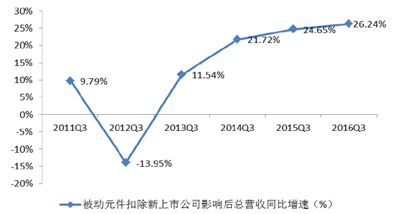 直接加總每年三季報所有公司總體營業收入,使得對比公司數量口徑不同。2015 年三季報后有新公司上市,如果直接加總2016 年三季報所有公司營業總收入與2015 年相比,則2016 年三季報總體營業收入數據統計公司比2015 年多,對比口徑不一。因此,扣除新上市公司影響后同期對比更能夠反映行業整體增速情況。