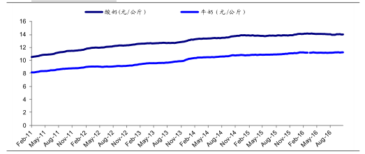 2016 年,主要奶產品價格相對穩定。10 月 28 日,酸奶零售價 14.00 元/公斤,同比增 1.01%,環比降 0.14%;牛奶 11.24 元/公斤,同比增 1.44%,環比持平。