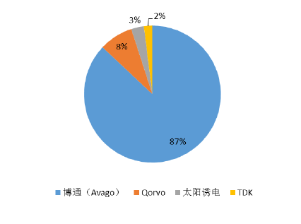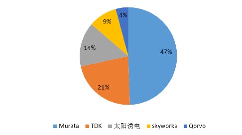 全球來看,saw 濾波器的主要供應商是TDK-EPCOS 及Murata,兩者合計占有60-70%市場份額;baw 濾波器的主要供應商是Avago 及Qorvo(Triquint),兩者占有90%以上市場份額。例如,iPhone 7 配臵了2 個大的濾波器組及2 個濾波器,其中TDK 供應了2 顆濾波器組及一顆濾波器,而Murata 供應了1 顆濾波器。
