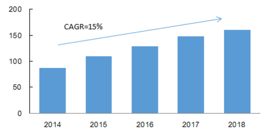 2014-2018年移動終端射頻器件市場規模(億美金)