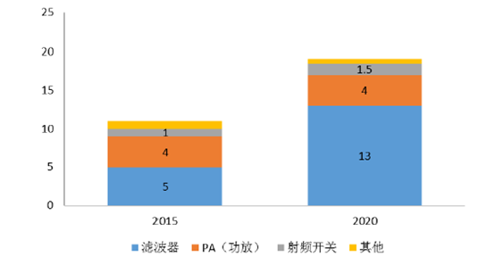 據預測,到2020 年濾波器市場將由2015 年的50 億美金增長至2020 年的120 億美金。Mobile Experts 的預測與高通基本一致,射頻濾波器是業界普遍認可的高成長細分行業。