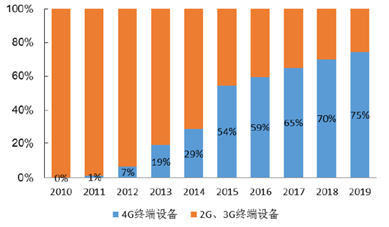 4G 終端滲透尚未飽和,根據臺灣砷化鎵代工巨頭win semiconductor 及美國Qorvo的數據預測,全球4G 通訊終端設備滲透率在2015 年達到54%,預計在2019 年將達到74.5%。