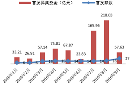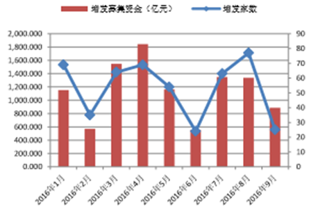 2016年三季度,證監會共核發了57家公司的首發,較二季度的43家進一步增長,IPO整體節奏有所加快。每月平均首發募集資金一改此前的下降趨勢,7月和8月的平均首發募集資金分別為11.85億元和13.63億元,較此前有明顯增長。定增方面,定增家數和增發募集資金在8月份達到高點后,都有回落態勢。