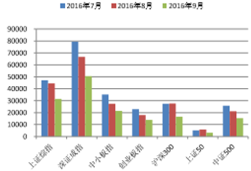 成交方面,在進入三季度后,成交量先是延續了6月份的增長趨勢,但在8月,各指數成交量表現分化。代表藍籌股的上證50和滬深300,成交量繼續走高,而中小板指和創業板則在總量和月日均成交量均出現明顯下滑。時間進入9月,受假期影響,市場觀望氣氛濃厚,各指數成交量均出現明顯下降。截止9月30日,A股累計成交金額為95.60萬億,同比下降52%。