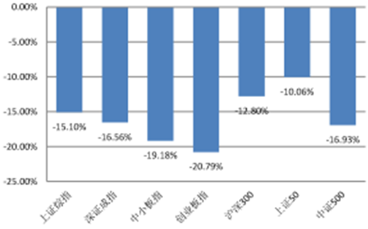 截止9月30日,上證綜指報收于3004.70點,年內漲跌幅-15.10%,深證成指報收于10567.58點,年內漲跌幅-16.56%,中小板指報收于6783.59點,年內漲跌幅-19.18%,創業板指報收于2148.90點,年內漲跌幅-20.79%。此外,滬深300年內漲跌幅-12.80%,上證50年內漲跌幅-10.06%,中證500年內漲跌幅-16.93%。整體來看,中小盤股相對跌幅較深,主要源于年初的下跌行情中藍籌相對高估值的中小盤更加抗跌。